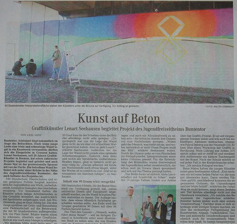 Nach weiteren Arbeitseinsätzen im Smog unter der Hochstraße, zwischen vier vielbefahrenen Spuren, im Kampf mit der Taubenkacke, neben dem Müll, den irgendwer dort deponiert -sprich: an einem der schönsten Orte Bremens- haben wir unser Werk gestern vollendet: „Mensch, wohin führt Deine Reise?“ Danke an den Beirat Neustadt für die Bewilligung der Fördergelder, danke an das …