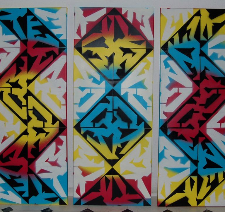 I started this triptych about two years ago but only finished it last week, two days before winter solstice. The background is done in cyan, magenta and yellow. The black and white stencil layers above consist of the five elements of my name K-E-N-M-O, so it took 20 steps on each of the three parts …