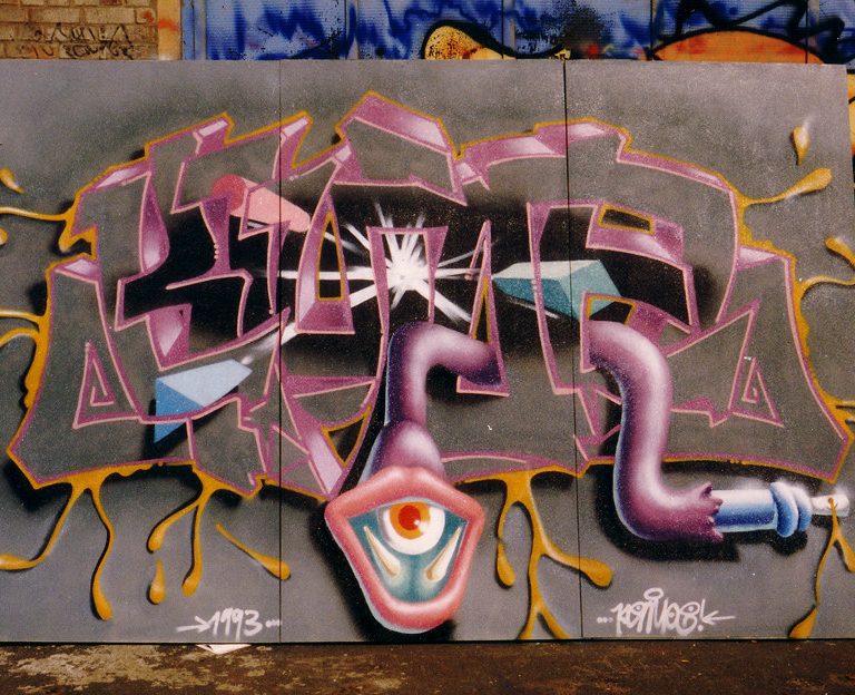In spring 1993 I took part in a Graffiti contest in Hamburg at the „Kampnagel“-area. You had to apply for it by sending in sketches, from which 25 participants were chosen. I just tried it out and was surprised to receive an invitation. One week off from school and they paid for the journey and …