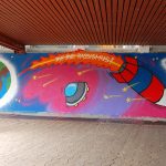 Das Werk ist vollendet – nach 4 Tagen Arbeit mit den Jugendlichen – und wurde heute nachmittag zum Abschluss der Projektwoche den Schülern, Freunden, Eltern und Lehrern präsentiert. Die Resonanz war ausgesprochen gut!