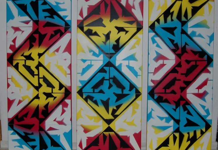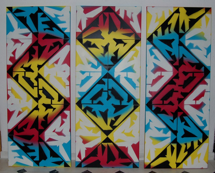 The size is 1m x 40cm each, 1,20m x 1m complete. Spraypaint on canvas.