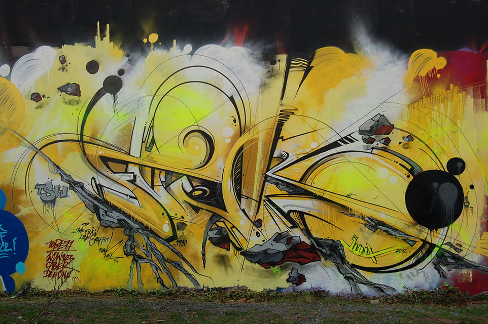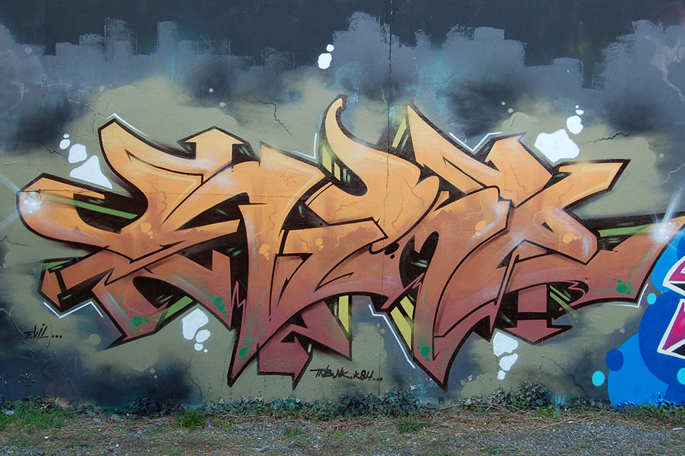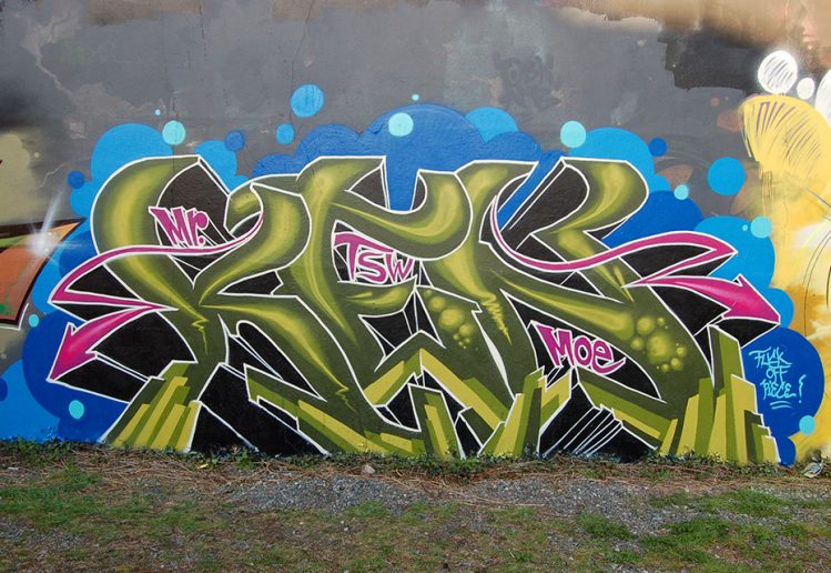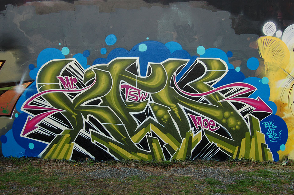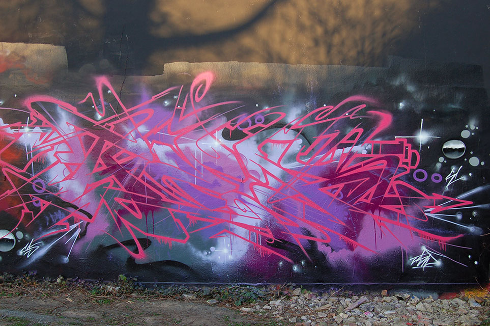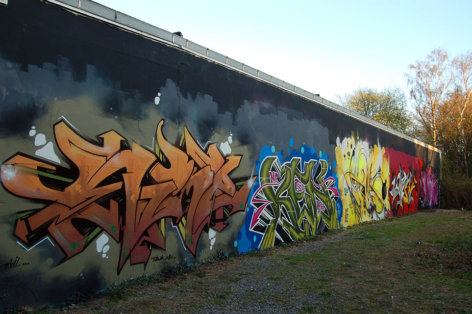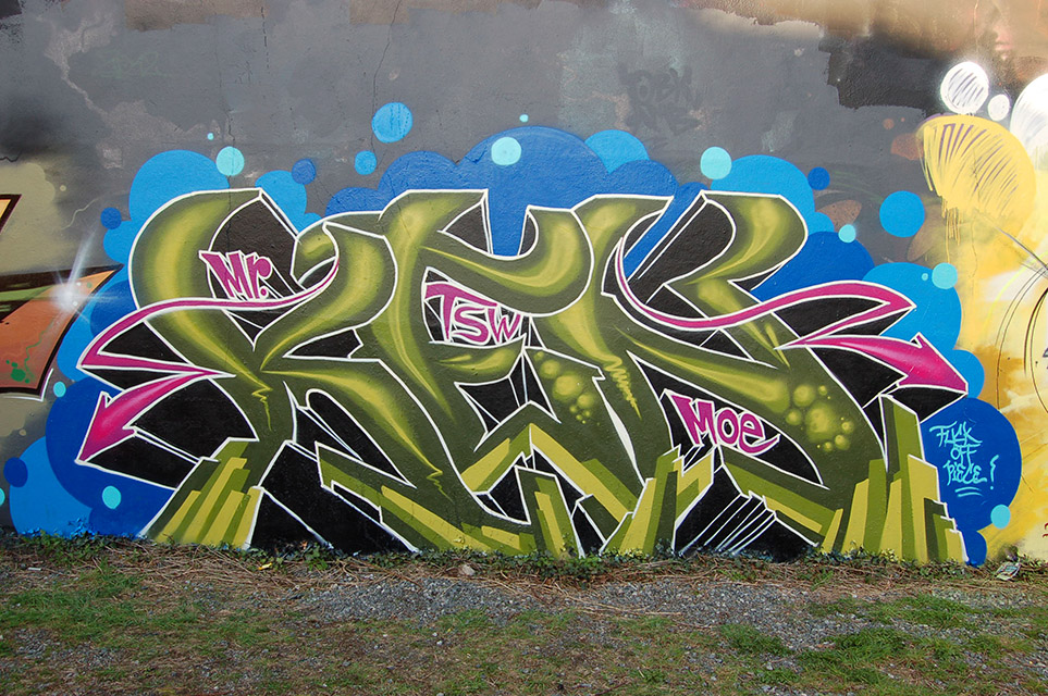 Yesterday I painted a wall together with a couple of old graffiti friends. It was quite spontaneous and I started freestyling with only a vague idea in mind. In the middle of work I felt that the shape of my letters didn´t really seem to fit my idea. I got so disappointed with it then that I decided to finish it quickly with just a bubble background and white outlines and call it the „Fuck Off Piece“! Sometimes I´m that type of guy that starts looking and thinking and re-thinking about my artwork and then go on with it until I brought it to a good end, but not really this time.