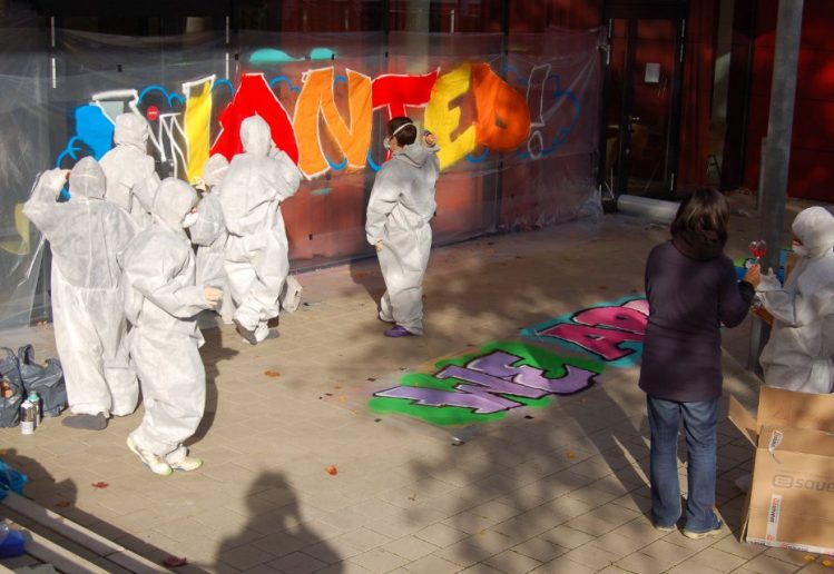 Am Montag habe ich einen Graffitiworkshop am Nebelthau-Gymnasium in Bremen-Lesum gegeben. 16 Schüler einer 7. Klasse, Durchschnittsalter 13, ohne große Vorbereitung. Da es nicht genug Raum gab, daß jede(r) sein/ihr eigenes Piece machen konnte, haben wir ein gemeinsames Werk für den Klassenraum gestaltet. Nach einigem hin- und her einigten sich die Kids auf den Slogan „We are most wanted!“